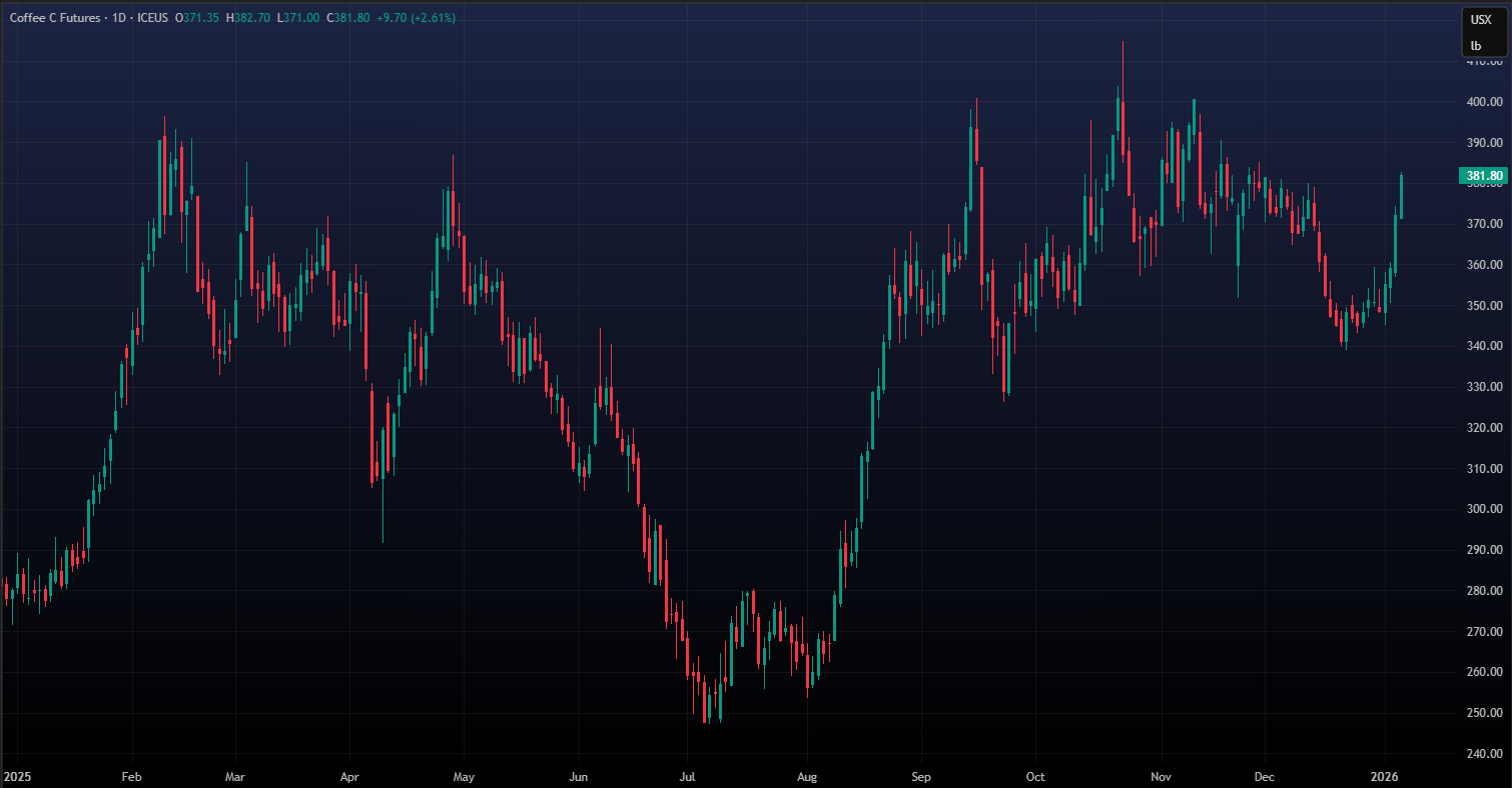 We kicked off 2025 with a bang, in the middle of a bull run, the likes of which had never been seen before. The first market open was on 2nd January at 321.55 c/lb, and it traded almost exclusively higher until it reached a record high of 429.96 c/lb on 12th February. (A record that was held for most of the year, until 23rd October, when the market hit the lofty heights of 437.95 c/lb.) After February’s high, the market eased off, but continued to flirt with the realm over 4$ until May. Not only were these extreme highs difficult for many players in the industry to manage, the very high level of volatility made that even more challenging. A high price can certainly be hard to swallow if you are buying, but it is easier to adapt to if it remains steady. Coffee had no such stability this past year, when prices have been swinging up and down, it has made it tricky to plan ahead for everyone, from producer to roaster. Whilst the +400 c/lb level has not lasted the year, the uncertainty and volatility that we started the year with has persisted. Unfortunately, not all made it through the turmoil; Atlantica and Cafebras (both Brazilian exporters) filed for bankruptcy in March.